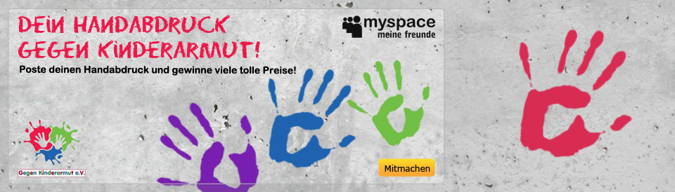 Liebe Freunde, MySpace Meine Welt und Gegen Kinderarmut e.V. sammeln Handabdrücke gegen Kinderarmut.Mach jetzt mit und poste deinen Handabdruck als Kommentar auf Meine Weltoder auf der MySpace Seite von Gegen Kinderarmut!
