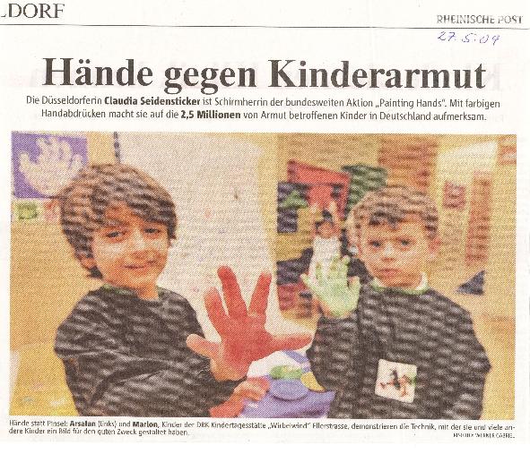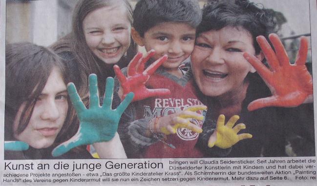Claudia Seidensticker: KRASS – Das größte Kinderatelier ist das Ergebnis einer Idee, die sich während meiner Tätigkeit als freischaffende Künstlerin bei der regelmäßigen Arbeit mit Kindern manifestierte. Wir stellen am 24.10.2009 in Düsseldorf unter dem Motto „Achtung! Fertig: Kunst…“einen gemeinsamen Erlebnisraum her, der kulturübergreifende Werte in den Mittelpunkt eines großen Events stellt. Dieses Projekt bestätigt einmal mehr die Möglichkeiten der persönlichen Entwicklung durch Kunst – unabhängig von Herkunft und Stand… Daher habe ich auch nicht lange gezögert, Schirmherrin für die „Painting Hands“ zu werden.