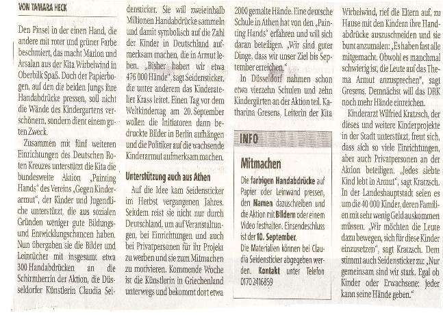 Claudia Seidensticker: Das ist nicht „mein Konzept“. „Painting Hands“ ist eine Aktion des Berliner Vereins Gegen Kinderarmut e.V. – Wir bringen so viele farbige Hände wie möglich auf Leinwand, dokumentieren unsere Aktionen und senden das Werk sowie die Fotos oder Videos vom Aktionstag an den Verein Gegen Kinderarmut e.V. nach Berlin. Jeder ist aufgerufen, seine Hand den in Armut lebenden Kindern zu reichen. In Schulen, auf Sportplätzen, bei Konzerten, Messen, in Vereinen oder Clubs… Zum Weltkindertag im September 2009 sollen dann alle Handabdrücke miteinander verbunden als “Gesamtwerk” unserer Regierung überreicht werden.