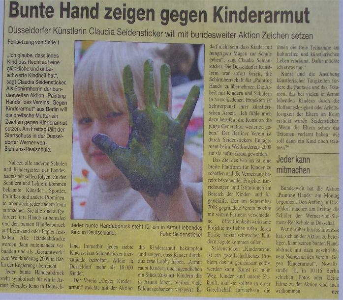 Am 9. März 2009 startet die diesjährige Aktion „Painting Hands“ des Berliner Vereins Gegen Kinderarmut e.V. Damit sollen möglichst viele Teilnehmer zum Einsenden ihrer farbigen Handabdrücke ermutigt werden, um diese – zusammengefügt zu einem „Gesamtwerk“ – anlässlich des Weltkindertags im September der Bundesregierung zu übergeben. (kdk)
