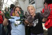 Bei der Aktion am 20.September 2008 werden farbige Hände auf eine weiße Leinwand aufgedruckt.